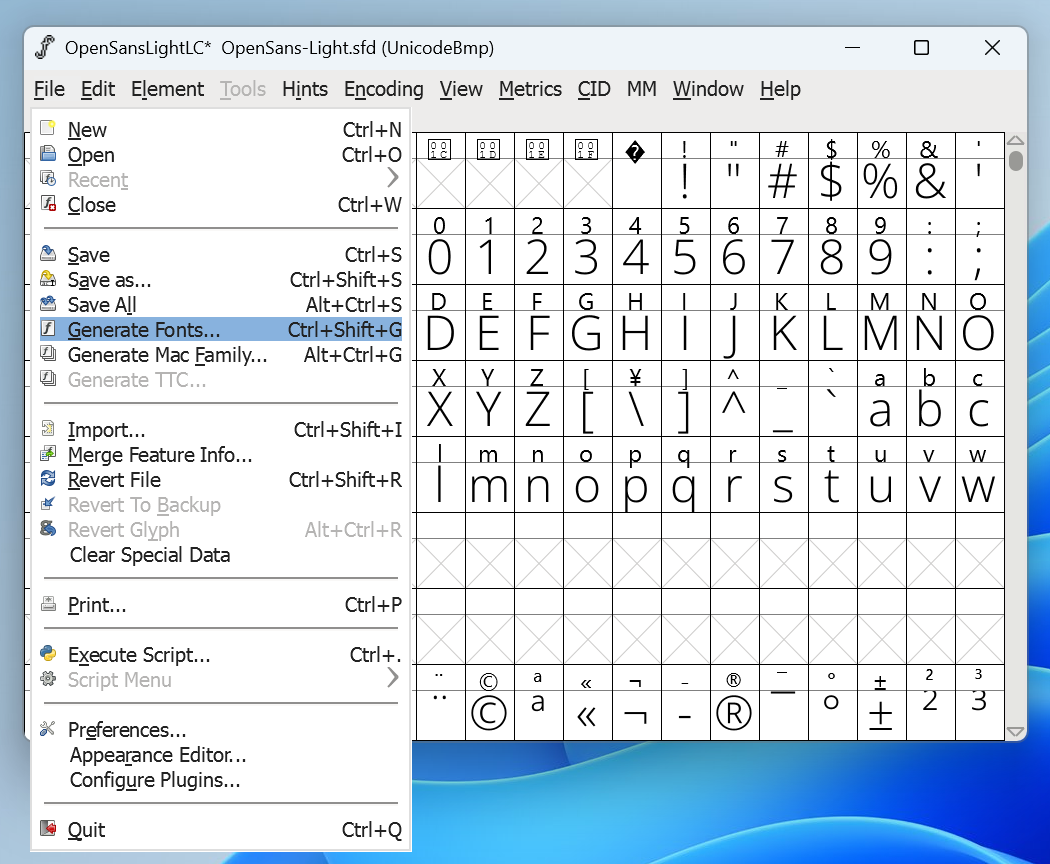 Now to regenerate the Font. Select "Generate Fonts..." from the "File" menu