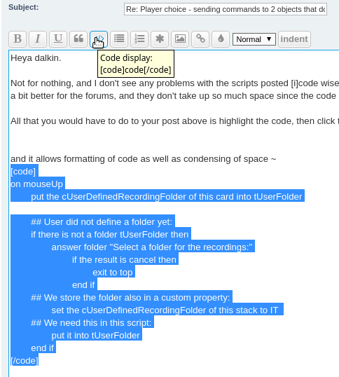 All that you would have to do to your post above is highlight the code, then click the button above the editor that says "Code display:",