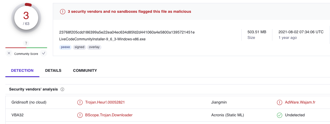Here's what VirusTotal has to say about LiveCodeCommunityInstaller-9_6_3-Windows-x86.exe: