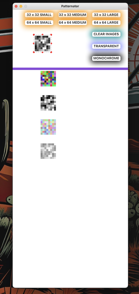 The attached Pattern Generator allows you to create 32 x 32 and 64 x 64 pixel images with different pattern styles and includes an option to create images with transparency. I have embedded core handlers from the Minimum Drawing Library (see Games) so this does not require the library to operate. I am releasing it as open source under the MIT license