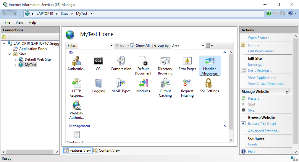 Open up the IIS Manager and expand down to the site that you want to work with. In my case it is a site called MyTest. Once I select that then the different IIS setting options are available. Notice that one of the options is CGI which wasn't there before. However, I left the default settings alone for the CGI module and chose the Handler Mappings.