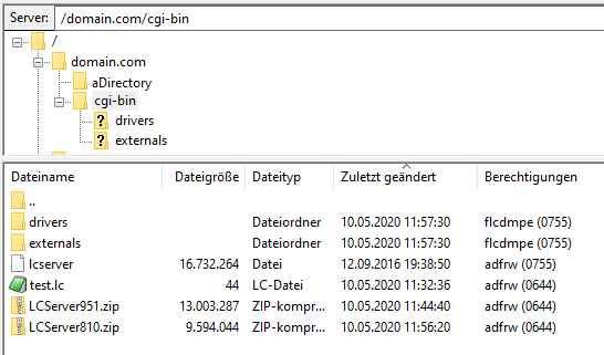 . - We need to "chmod" (change acces privileges) our server application now to "755" via Filezilla or SSH, and we may rename it - I use "lcserver" for easy access. What we have now should look like this (I've renamed some things ...):