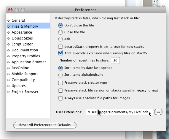 Now, how to get the plugin to show up. The folder you made is in the right location, you have to change a setting in the preferences in Lc. Click on 'Files & Memory', and go to the box that says "User extensions". Change that to the My 'Livecode' folder. Now the plugin should show up.