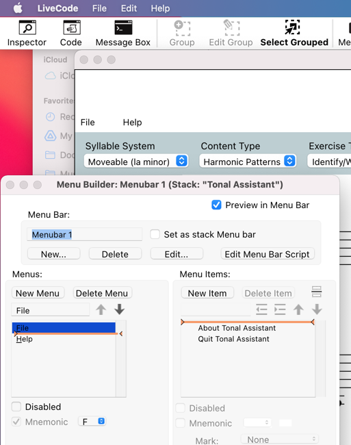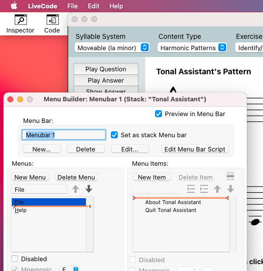 The first attachment shows Menu Builder status with "Set as stack Menu bar" checked. This is how a Mac standalone gets structured, which is as it should be for Mac, except the menubar menus are wrong: the defaultMenubar rather than Menubar 1 as set in the Menu Builder and also established in openStack with "set the menuBar of this stack to "Menubar 1".