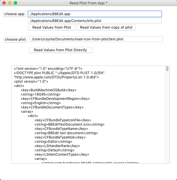 At this point, I am just trying to pull in an application's Info plist file as plain old text so that I can parse it for the appropriate location of the icon file in the package. That's not important here, as I already have a script that parses that stuff out from a well-formed plist field already, and that works fine.