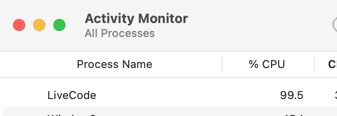 I'm back on the prowl for solutions to issues with OSX Big Sur and LC. I have recently upgraded to LC 9.6.5 RC1 and the crashing, freezing I have experienced on earlier LC versions persists. Here's a screenshot of the Activity Monitor running at 99.5% .. oh, and did I mention that I had to force quit LC BEFORE I took a snapshot of the CPU resources.