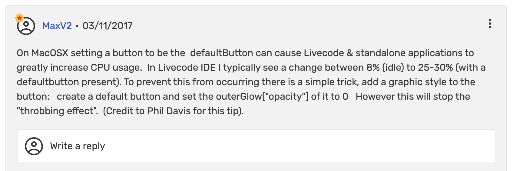 The engine does not - I must confess I thought that there was some direct API we used to query the animation requirements but it appears there is not, and thus if a button is labelled as default and is being rendered as a themed button then it still periodically redraws.FourthWorld wrote: ↑Fri Oct 01, 2021 6:52 pmYep. I described it in past tense for that reason. But I'm not sure if the LC engine special-cases its redraw for newer macOS versions that no longer need the constant churn. Hopefully Mark can clarify (or perhaps I missed it in his earlier replies here).