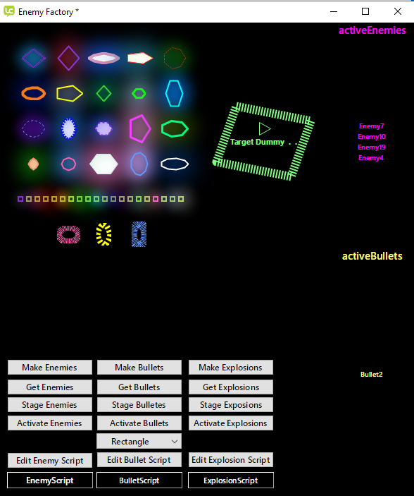 The enemy scripts call ActivateBullets from the main stack script so I added the enemy bullets in the stack along with their scripts and everything works mostly just like the Missile Factory, only we don't test/adjust bullet speeds since they are randomized and rely on the player to target...hmm, might have to make the Enemy Factory bigger to test against a "Player" object. But for now these are the elements: