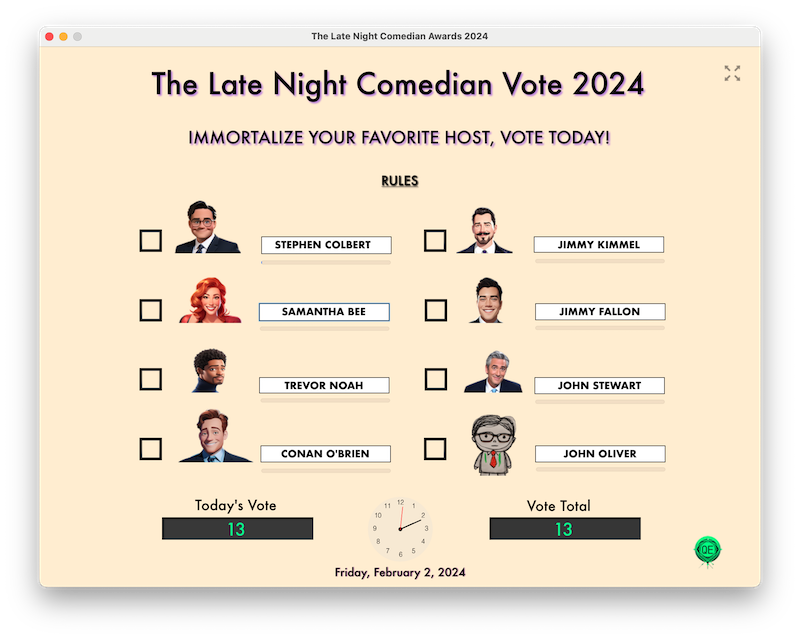 In this stack I was attempting to simulate voting as though it were coming in from external voting centers in addition to you casting your own votes. I played with various rates and wanted to apportion the voting somewhat randomly for the various comedians. It got a bit complicated integrating the progress bar updates. I did occasionally run into that IDE exception error during development, but I haven't seen any problems with the stack or app.