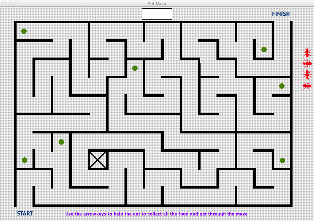 There are 7 green images (food), and the "ant" should consist of a graphic object that can be moved using the arrowKeys