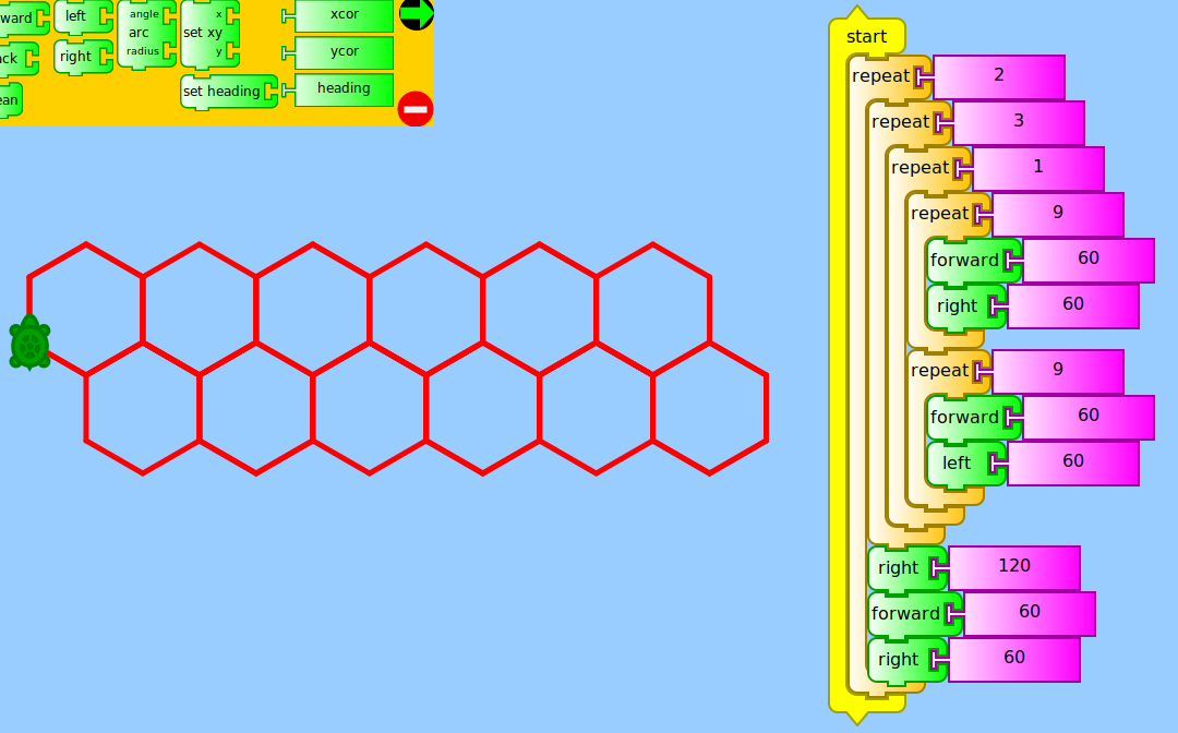 I created a simple hexagonal grid using TurtleArt: http://wiki.sugarlabs.org/go/Activities/Turtle_Art