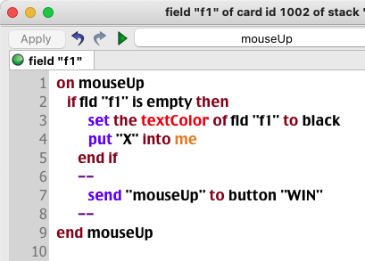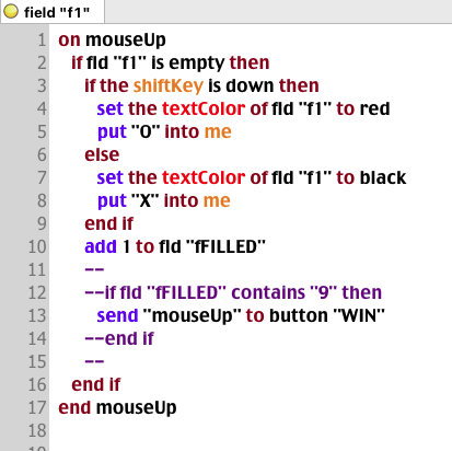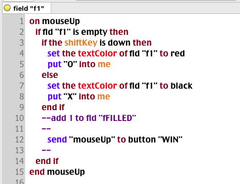 When the field "fFILLED" contains '9' a 'mouseUp' signal is sent to the button "WIN"