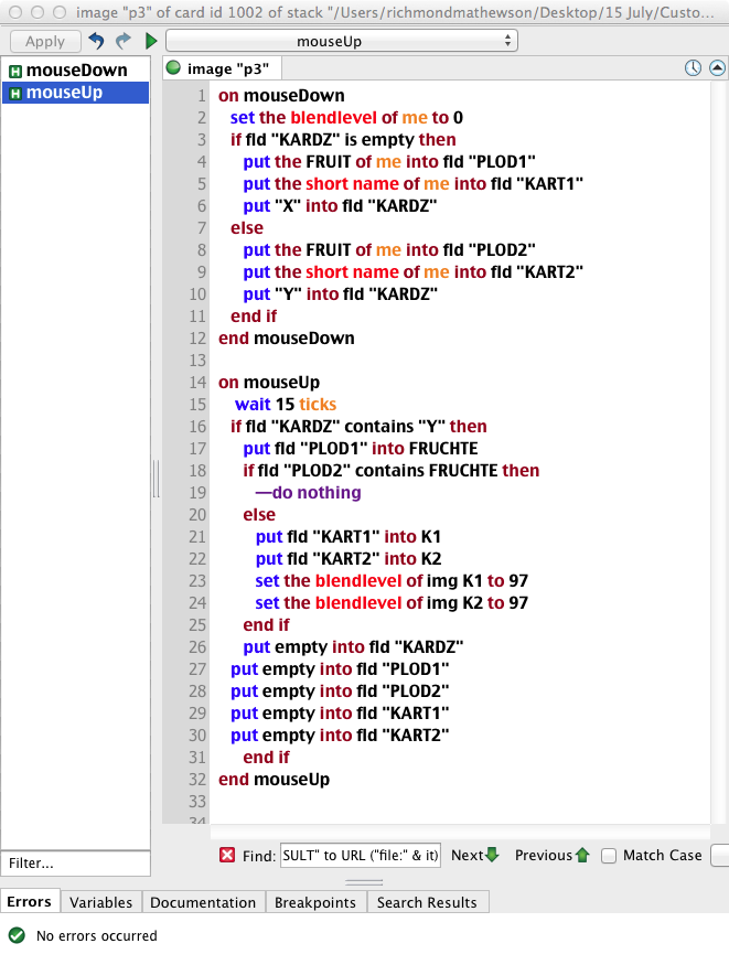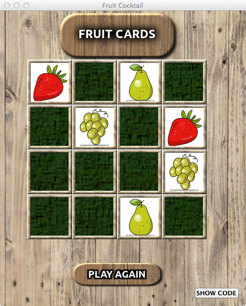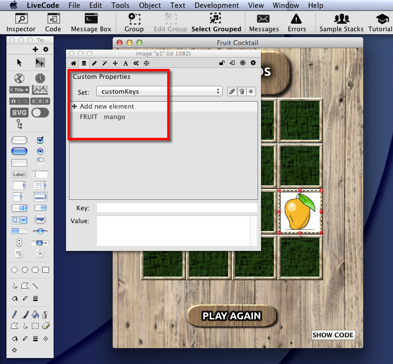This stack is a variation on the extremely corny old Pelmanism game that leverages custom properties: each of the “fruit cards” has a custom property assigned to it called (possibly rather unimaginatively) ‘FRUIT’ that is used to identify what is on the fruit card’s “face” for matching.