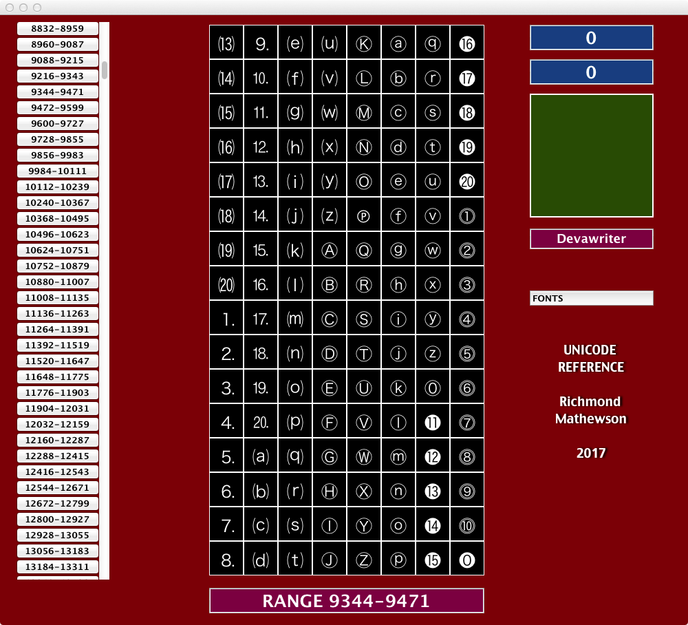 I couldn't find a handy Unicode reference thingy for Macintosh that I liked, so I brewed my own: