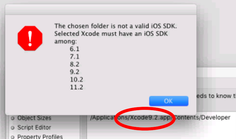 In Livecode when setting the Mobile Support in Livecode preferences, I choose xCode for IOS SDK's and get an error "The chosen folder is not a valid IOS SDK. The selected XCODE must have a valid SDK among 8.2 - 12."