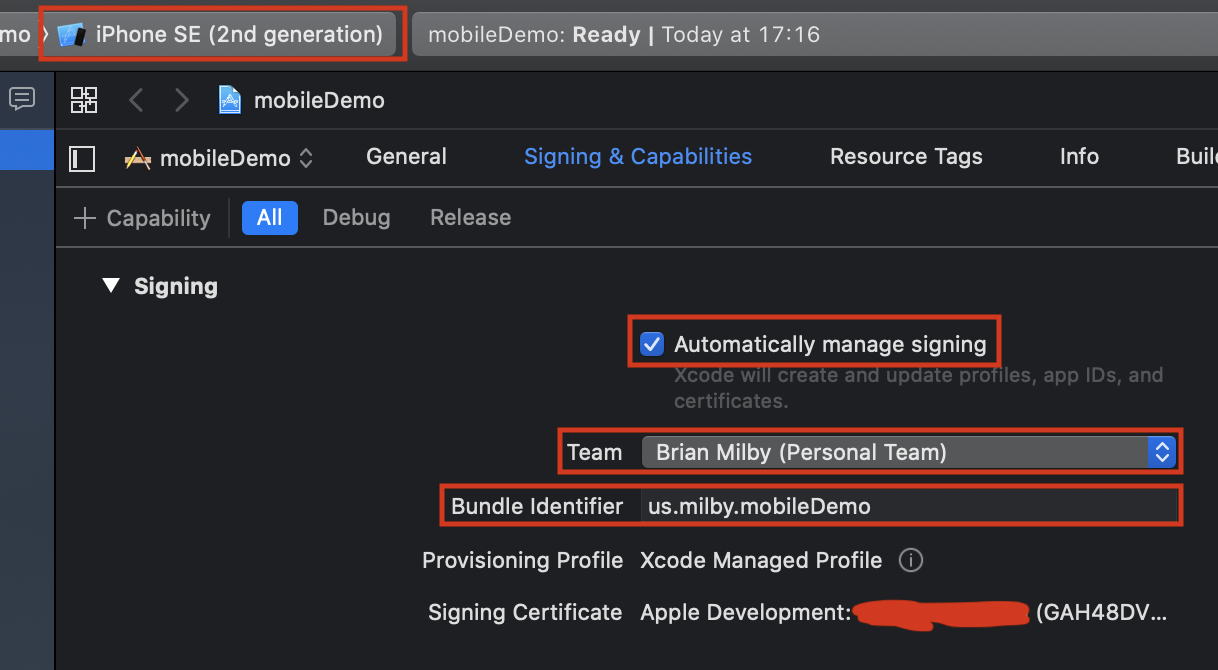 With your phone connected (and probably unlocked/authorized for Xcode), you will need to select it in the top of the project window (where it currently has iPhone SE). Leave the automatically manage option selected. Team should just be your name (if not there, you will need to add it and use the free dev account that you created). The bundle identifier will match the internal app id in LC. You set it in Xcode and when you select the profile in LC it will prompt you and change it if they don't match.