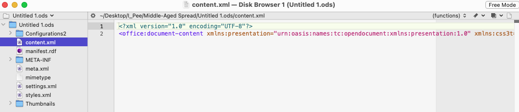 Rich Siegel at Bare Bones software has sent me a preview copy of BBEdit [14.6.7] as version 14.6.6 was crashing on attempting to read the contents of an .ODS 'file' on macOS 14 beta 5, and THAT allows the 'content.xml' bit to be opened in a reasonably readable format, that would be easy enough (although fairly tedious) to parse in LiveCode directly . . .