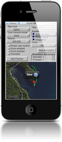 This sneak peek shows a polyline and an annotation callout. Clicking the disclosure triangle sends a callback message to your stack. Note the pristine waters of southern Tasmania where I went for a dive yesterday to get some nice abalone for dinner