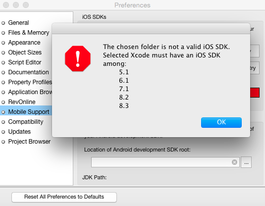 Trying the same with LC 7.0.6 the error message is: "The chosen folder is not a valid iOS SDK. Selected XCOde must have an iOS SDK among 5.1, 6.1, 7.1, 8.2, 8.3"