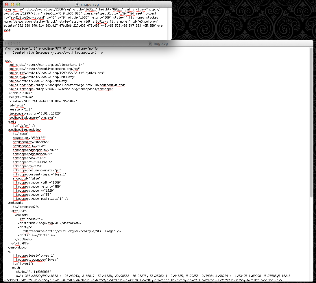 If one opens the following with a text editor, and an Inkscape one in a similar way the difference is obvious.