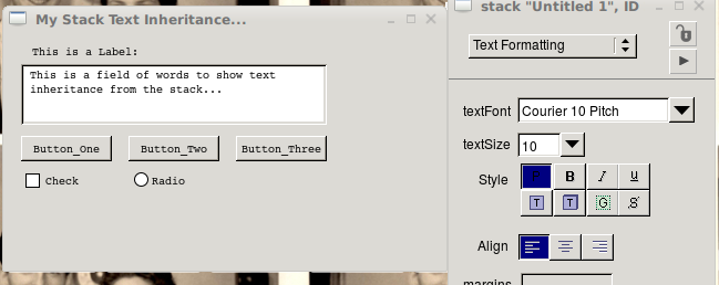 Here is a picture with the defaults in place and 3 controls. Once you set the text formatting of the stack, all of the controls automatically inherit that as Klaus pointed out, as well as any new controls you add. The exception will be the Title bar for the window, it will have the font and the size is determined by the OS setting. Next, let us say that you wanted to make the field text bold, but retain the font of the stack. Clicking on the control, in the text formatting area, simply click on bold. When I am setting up my design, I normally just drag one of each control out and make sure it looks how I think it should, then if I need more of that control, I ctrl/click/drag it to where it is needed, or copy/paste it, however if you wanted something like that you could just make a template control with the changes desired as well.