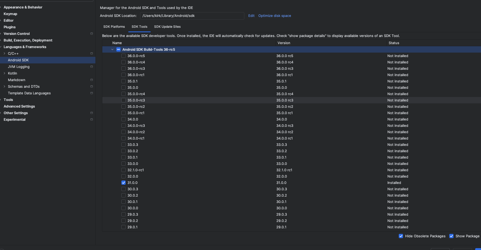 UNCHECK "Hide Obsolete Packaged" and "Show Package Details".