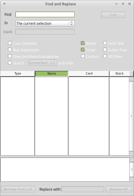 Could the Find and Replace [i.e. revSearch] stack be made less geeky?