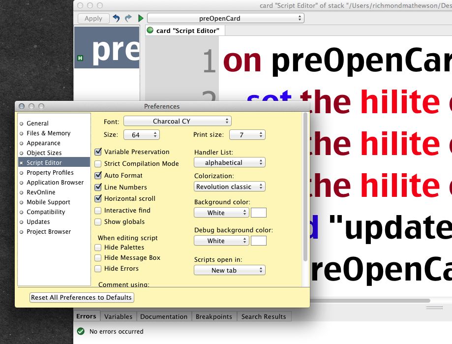 The hard wired script editor font size limit of 20 pt can be a bit small for comfort for those with poor eyesight.
