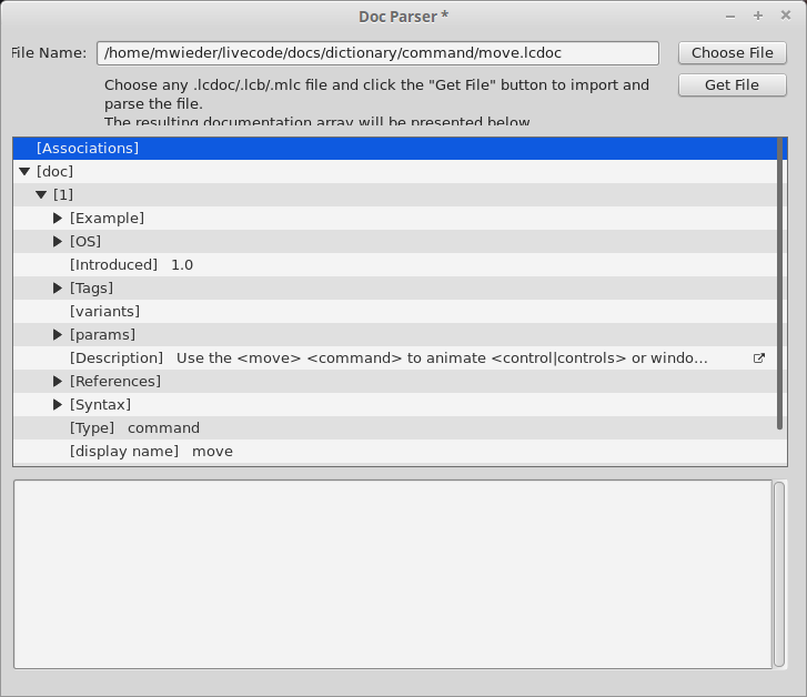 https://github.com/livecode/livecode-id ... cript#L692 I see a dispatch function call to revDocsParseDocFileToLibraryArray(), but I'm unable to get that working. Even passing 'normal' lcdoc files (move.lcdoc, for example) returns an array with just 'Associations' and 'author' as elements, and both are empty.