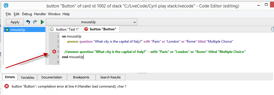 On page 93 (section 4.2.9) it gives an example of the answer dialog. I copied the code in from the PDF but get an error.