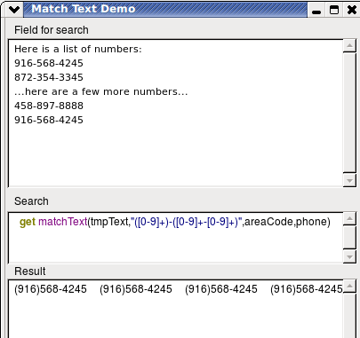 get matchText(tmpText,"([0-9]+)-([0-9]+-[0-9]+)",areaCode,phone)