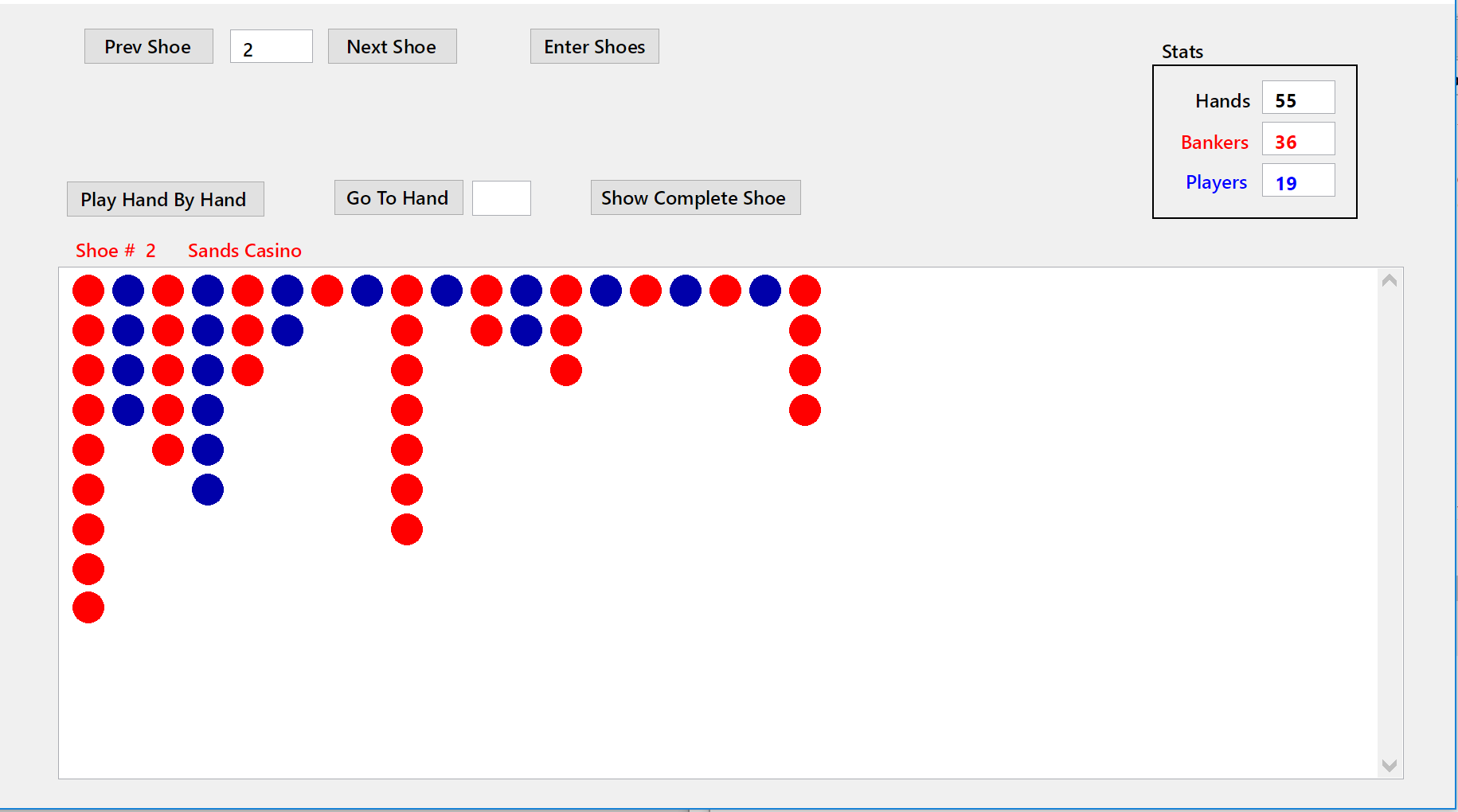 here is the code for the "show complete shoe" and it works perfect. Is there a way to to have the repeat with statements wait for a button press each time or how would i do this one by one. The button sets all the variables and clears the grid as well. Just want to hit it each time and have a dot appear in the right spot. This way the user can see just one hand at a time like playing in a casino.