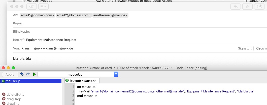 revMail "email1@domain.com",,"Equipment Maintenance Request", tEmail- http://livecode.wikia.com/wiki/RevMailaddress (string): A string consisting of one or more email addresses, separated by commas.These addresses appear in the 'To:' header of the email message.