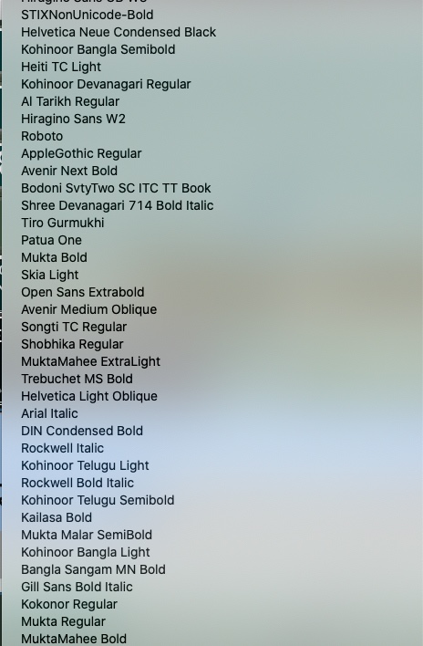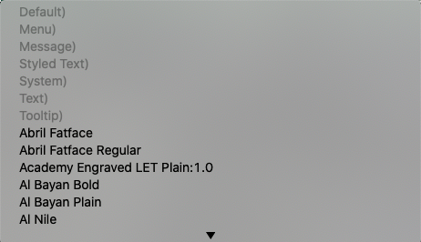 Well, you start with this code....richmond62 wrote: ↑Wed Apr 22, 2020 7:48 amHow does one stop "all that cack" [the top bit in the snapshot] from showing up in a font list on MacOS?