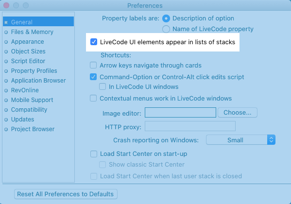 I have found Preferences and I have a choice for the Project Browser to show sections: Front Scripts, Stacks, Back scripts and Stacks in use. I don't yet know what front scripts and back scripts are but that isn't the point here. If I choose "Stacks" I see the whole list of extensions, etc. But if I do not select Stacks and only choose "Stacks in Use", I assume that if I only have one stack in memory, that it will show up, alone, in the list. However, even the stack that is open does not show up for me. Please tell me what I need to do to list only the stack(s) that I am currently working with or rather loaded into memory.