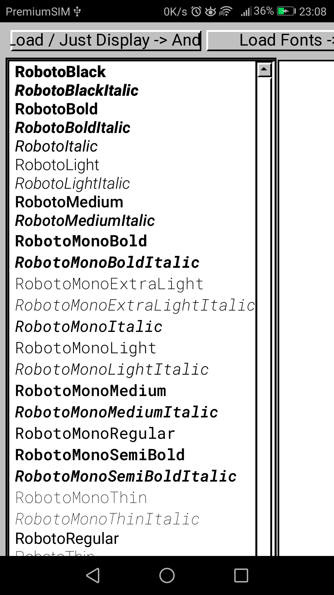 Setting a field to such font name only works for "Roboto" as such, but not for any of the speical font flavours. For example, setting the textfont of field 1 to "Roboto-light" does not work. All these flavours of the font are also not listed in the standard font menu. I can change styles using the style menu, but not get the "light" or "extra light" versions of the Roboto font.
