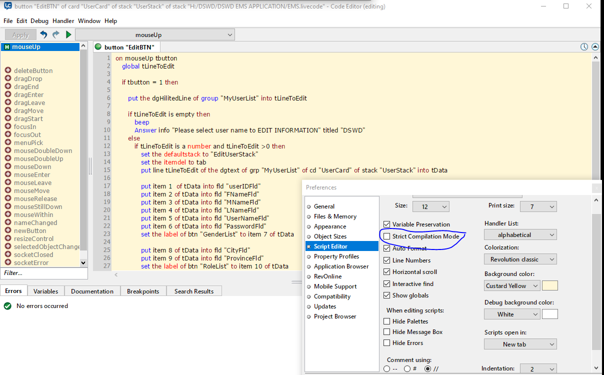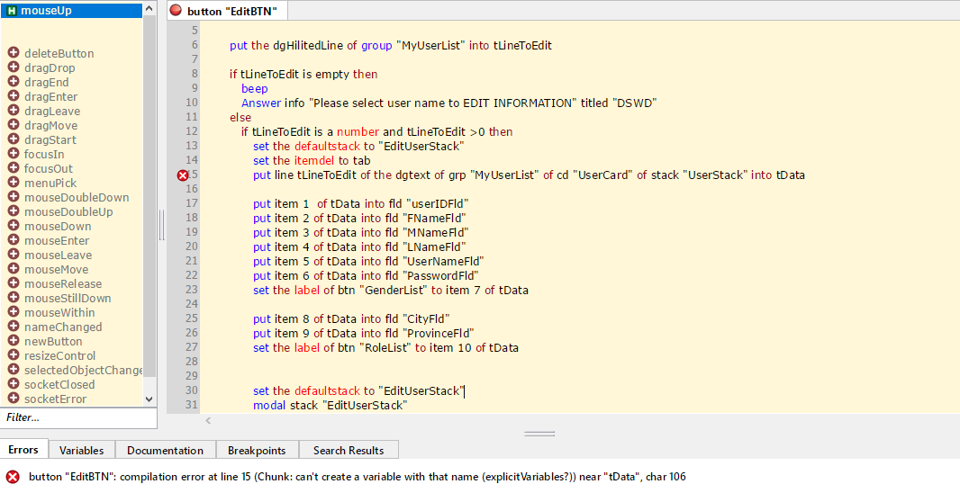 below is my code for my edit button. first run (project file) it will work but now once i open the edit script it has a error. before it's working in the community version and standalone application. I tried to run in starter livecode and community version same result has error but before it is working.