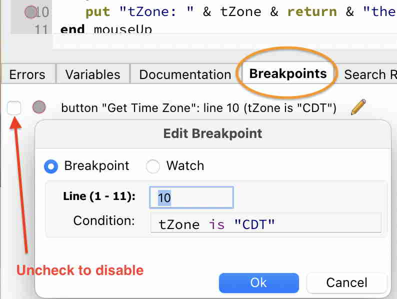Hi Jacque, I just posted a "possible bug" related to clearing a breakpoint (https://quality.livecode.com/show_bug.cgi?id=23940). The user guide I checked did not have complete information on setting conditional red dot breakpoints. There is this, but I was not able to find any discussion of conditional red-dots: