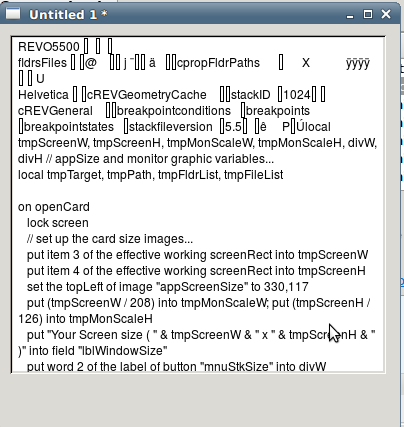 If you were, for example, to open a stack file in it, you will see a great deal of actual code, mixed with scrambled ascii where the binary bits are (again, provided the editor can open the file without error), such as what you see below...