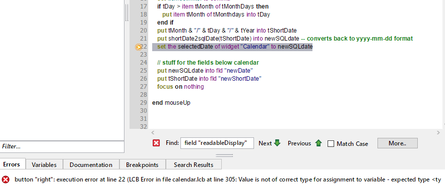 Then trying to change the date via selecting the navigation arrows in the calendar widget pane gives an error: button "right": execution error at line 22 (LCB Error in file calendar.lcb at line 305: Value is not of correct type for assignment to variable - expected type <type: livecode.lang.number> for assigning to variable mSelectedYear in com.livecode.widget.calendar.)