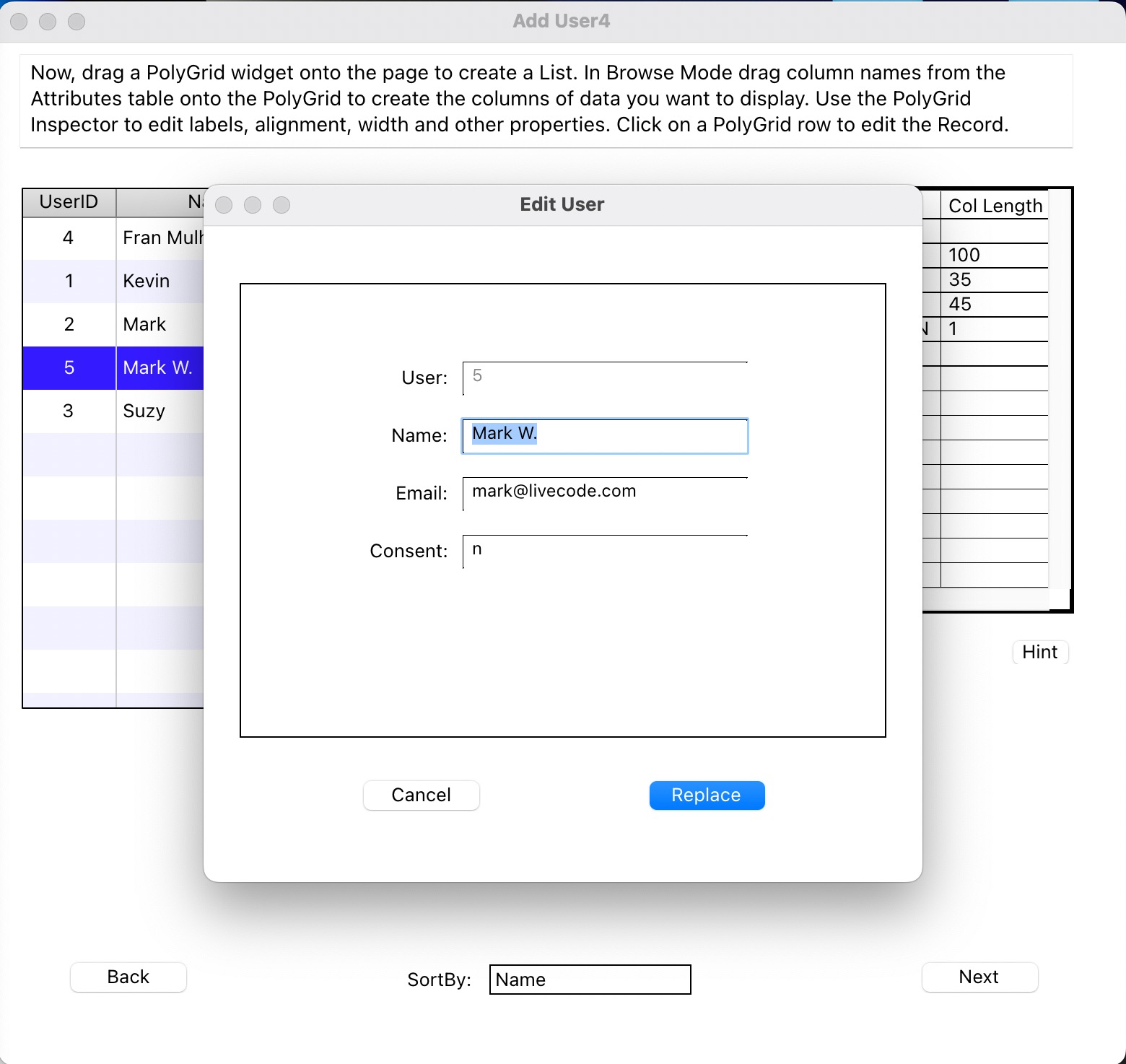 Yes Jacque, there is a drag and drop involved. A picture being worth a thousand words I've included two. As you can see there is table of SQL column attributes on the right. The user is instructed to drag a polygrid onto the card and then populate it with columns by dragging objects from the SQL attributes table to the PG. This all works really well. My drop code is in the card so the populating of columns does not require any PG handler. However, the last part of the instruction "Click on a PolyGrid row to edit the record" does. The 2nd image demonstrates what this looks like, and its handled by adding this code to the PG.