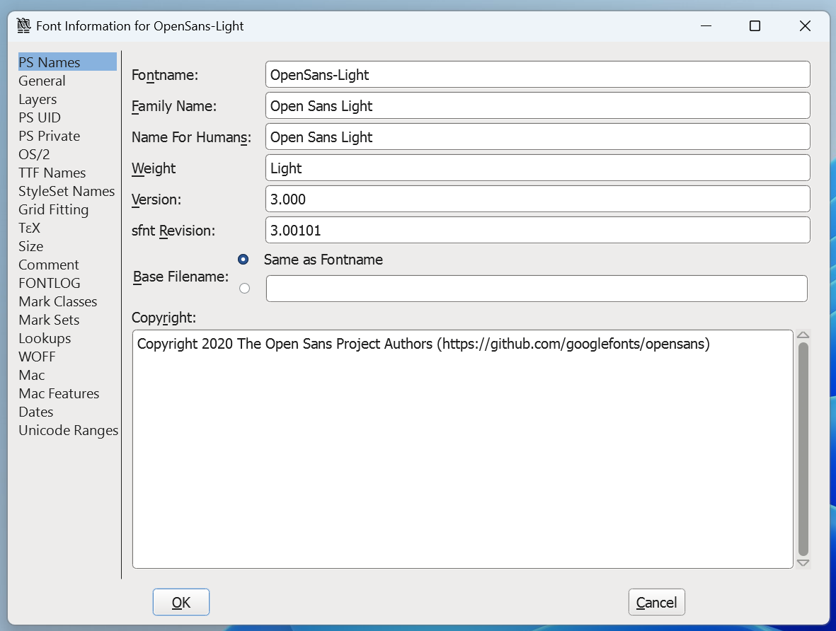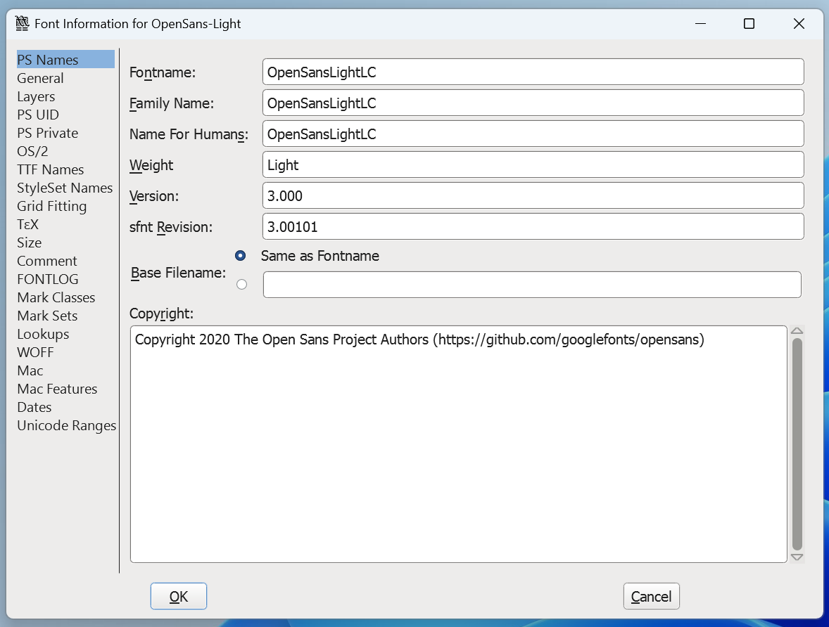 Change the Fontname, Family Name and Name for Humans to a name of your choice.