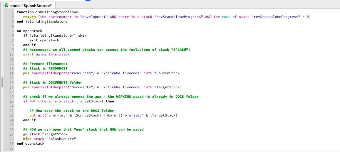 To avoid problems originating from preOpen/Open scripts (for example the splash stack calling the mainstack) i found i have to close all stacks, suspend messages (Development menu -> suspend messages), open the splash stack, build my app, then allow messages again. I prefer this to filling my stack with code just to build the app and it works very well for me.