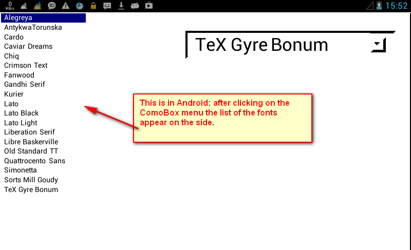 I have a ComboBox Menu on a settings card in a stack and it looks good in the LC IDE. But when I create the standalone app and install it in Android tablet then it looks strange with the list of fonts on the side and very small text size in the list.
