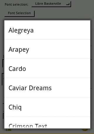 Actually the android native scroll field is more practical simply because it shows more name fonts at a glance without needing to scroll. On screens that have some selection to be done I always prefer to get as much info as possible with less clicking or scrolling required. Still the native android could be improved so I did it the way that the font names show their own style (see the stack; font can be selected by tap on its name and the tap outside the font list is closing the list without any changes):