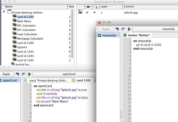 I decided to go along the route of creating a card which is Number 1 and called it Splash1, In the Stack Script I have