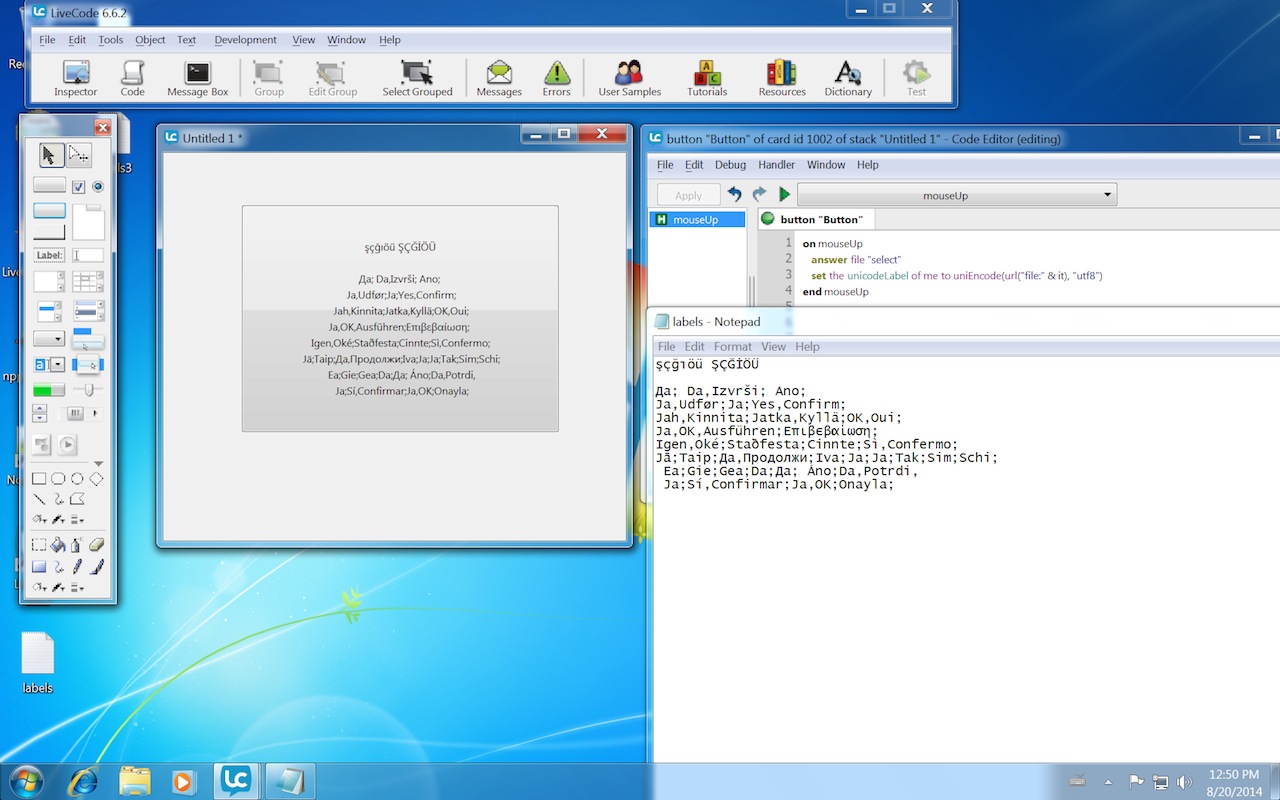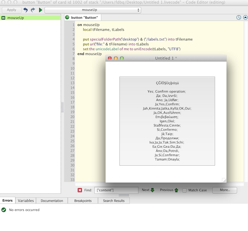 The language list (0.0) is my selector for changing some of the button labels in my stacks based on the ETSI European Language selection. The second line (1.1) is one of a large number (74 in command language release 2.1.1) of command names in the aforementioned languages. UTF8 cut and pasted nicely into the field (and into this window) and allowed formatting, changing punctuation, etc. But when I select one of the items and set a button's label to it, it generally fails for the languages with non-Latin characters (totally for the Cyrillic based and Greek, and partially for the Turkics) . I tried variations of useUnicode, unicodeLabel, etc. I believe the issue is twofold - one is my ignorance of the specific details of the Unicode implementation in LC versions. The documents seem to say I can use UTF16 on button labels? I tried setting the unicodeLabels of the buttons but that also failed miserably, giving me a wide array of ideograms instead. Is there a UTF8 to UTF16 conversion method?0.0; Languages; Available command languages; Bulgarian; Croatian; Czech; Danish; Dutch; English; Estonian; Finnish; French; German; Greek; Hungarian; Icelandic; Irish; Italian; Latvian; Lithuanian; Macedonian; Maltese; Norwegian Bokmål; Norwegian Nynorsk; Polish; Portuguese; Raeto-Romance Ladin; Raeto-Romance Surmiran; Raeto-Romance Sursilvan; Raeto-Romance Rumantsch Grischun; Romanian; Russian; Slovak; Slovene; Spanish; Swedish; Turkish;