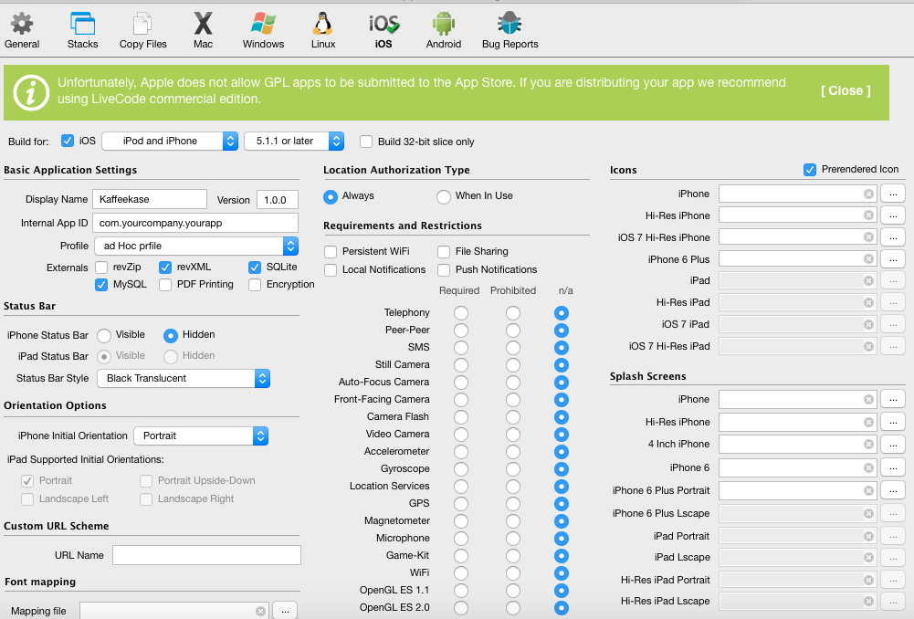 The green bar in the standalone settings explains it. Apple doesn't allow open source software in the App Store, so you can't build with the free community edition of LiveCode. You'll need to purchase the commercial version to make iOS apps.