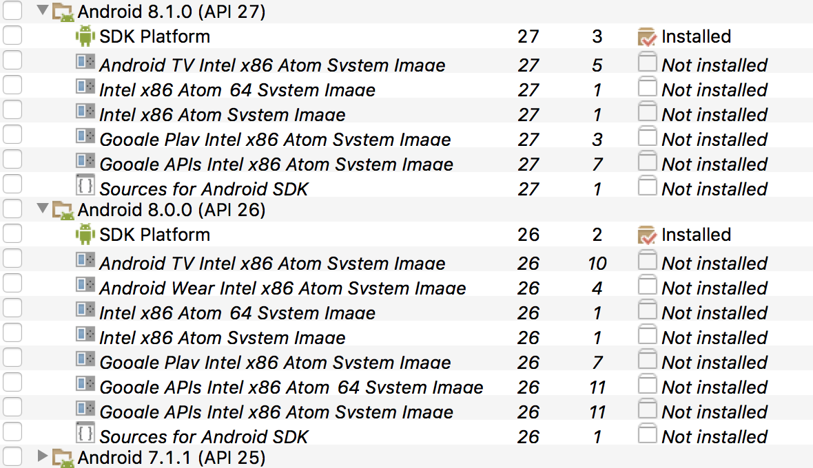 The screnshots below show some of the build tools I have installed (there are some years-worth in there) and also a couple of the packages. You don't really need all the extra junk in the packages, I usually only install the SDK Platform for each.