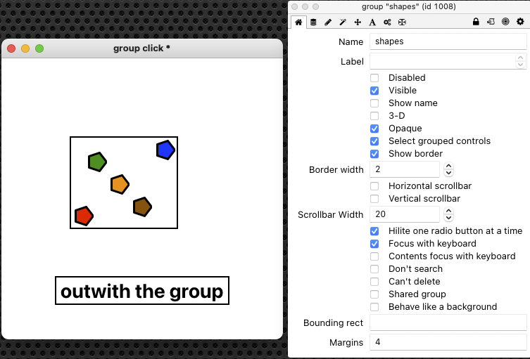 If you are following this thread, know that a group, though indeed a real control, does not quite have the solidity of, say, a button. It is defined in space by the extents of its child controls, but does not have any real substance apart from those controls. In other words, the empty space between controls in a group does not seem to be "part" of that group, in the sense that it has solidity.